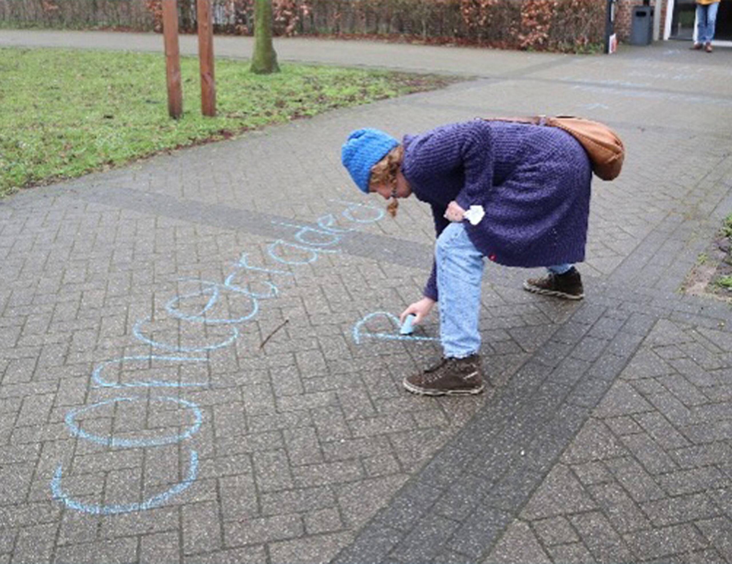Met grote blauwe letters kalkte Lea met stoepkrijt ‘Concentrated Blue’ voor de ingang van de Weverij, met een pijl naar het Living Museum. Door deze aanmoediging wisten veel mensen het Living Museum te vinden. Ondanks – of dankzij?! – de buien zag je mensen eerst binnendruppelen, en later zelfs binnenstromen. Soms wat aarzelend en onwennig, maar als ze aangesproken werden ontstonden er levendige gesprekken.