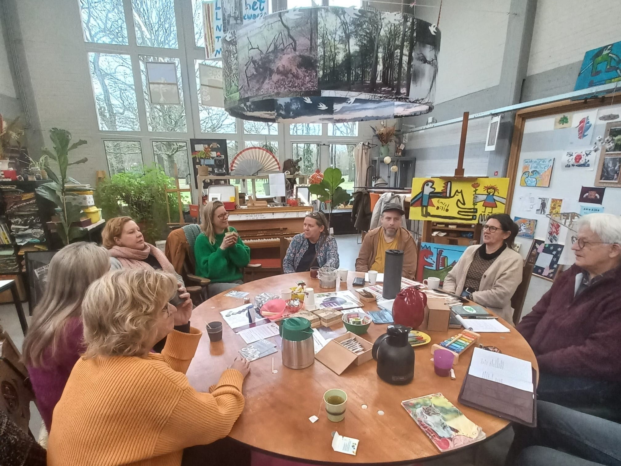 Op 9 mei kwam de Gemeente Vught op bezoek bij het Living Museum om te kijken wat Reinier van Arkel zou kunnen betekenen voor bewoners van Vught, Cromvoirt en Helvoirt. Dit past goed bij de laatste inzichten over zorg voor elkaar: hoe kunnen verschillende organisaties samenwerken om mensen die het nodig hebben hulp te bieden? In het Living Museum waren Arjen en Harold aanwezig. Wim had voor koffie en thee gezorgd en speciaal het ‘mooie’ servies uit de kast gehaald. Ook lagen verschillende folders, flyers en brochures over allerlei activiteiten uitgestald. Van de gemeente waren er diverse medewerkers meegekomen: Nadine van Gerven (WMO) en mantelzorgconsulente Nina Melissen, allebei van Wegwijs in de wijk. Jos van der Leest, een onafhankelijke cliëntondersteuner (OCO bij MEE), maatschappelijk werkster Iris van Groessen (Farent) en Julia Dabekaussen, welzijnswerkster uit Vught. De vertegenwoordiging vanuit Reinier van Arkel: een medewerkster van het vrijwilligerswerk, IPS- trajectbegeleider, herstelacademie ‘De Stijl’, de houtwerkplaats en ‘De Spoel’. Na het bekende voorstelrondje vertelden Wim, Harold en Arjen over het Living Museum: doel, ideeën erachter, sfeer, de kunstenaars …