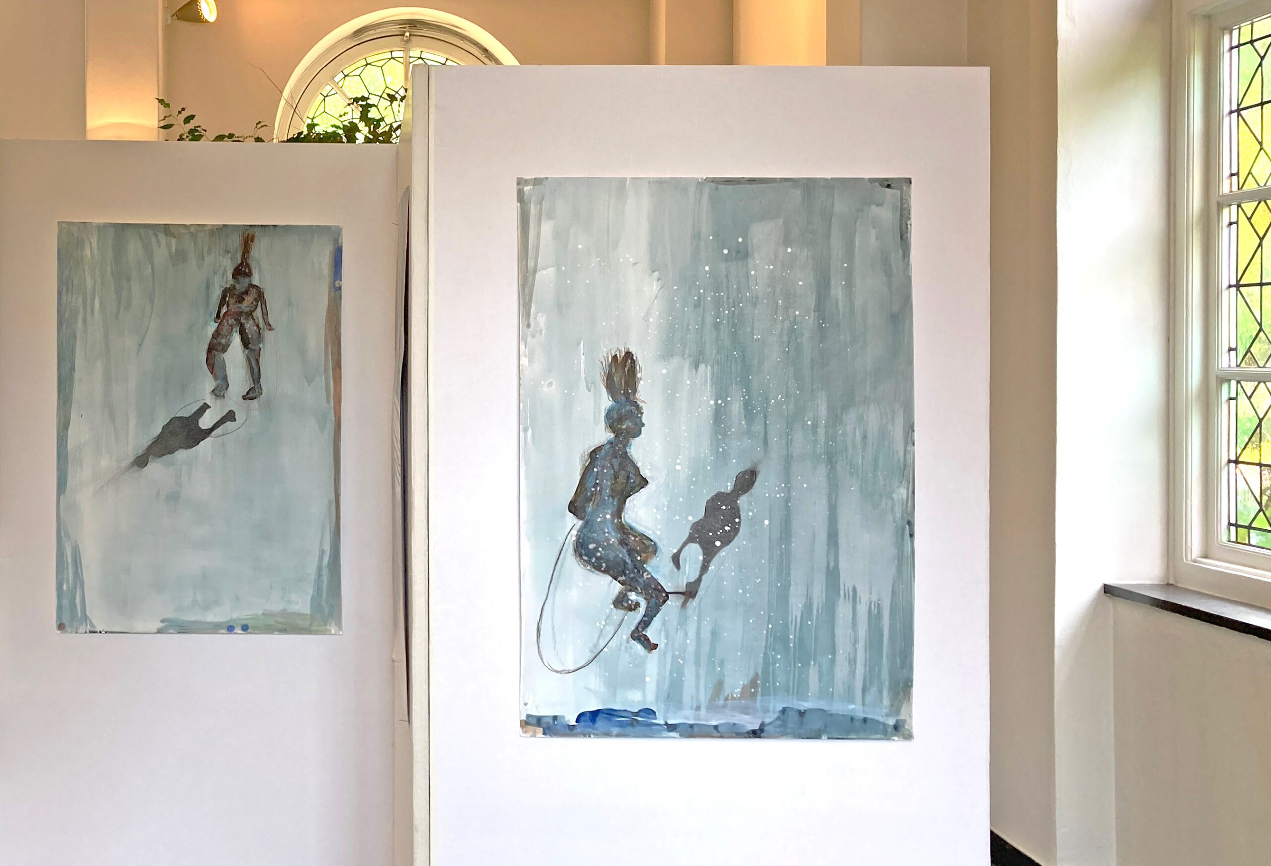 Hoe vaak zou Lea de touwtje springende vrouw, een beeldhouwwerk van haar vader, getekend hebben? In de tentoonstelling In between I kom je deze vrouw een paar keer tegen, steeds in contact met haar eigen schaduw. Net als veel andere tekeningen, zoals bijvoorbeeld het wolkje, bekijkt Lea haar onderwerpen van meerdere kanten. Met behulp van verschillende materialen geeft ze ze weer. Haar tekeningen krijgen er een grote intensiteit en gelaagdheid door.