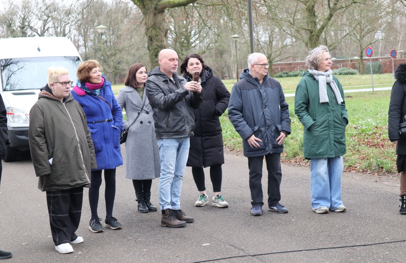 De straat van de Rebushalte is zoals gewoonlijk even afgezet met de rood-witte plastic linten. Toegestroomd zijn cliënten, deels in rolstoelen, met hun begeleiders, familie en Elians begeleidster Ans, leden van het Living Museum en verschillende andere belangstellenden. Het is de negende keer dat er een ‘maker’ exposeert in de Rebushalte.